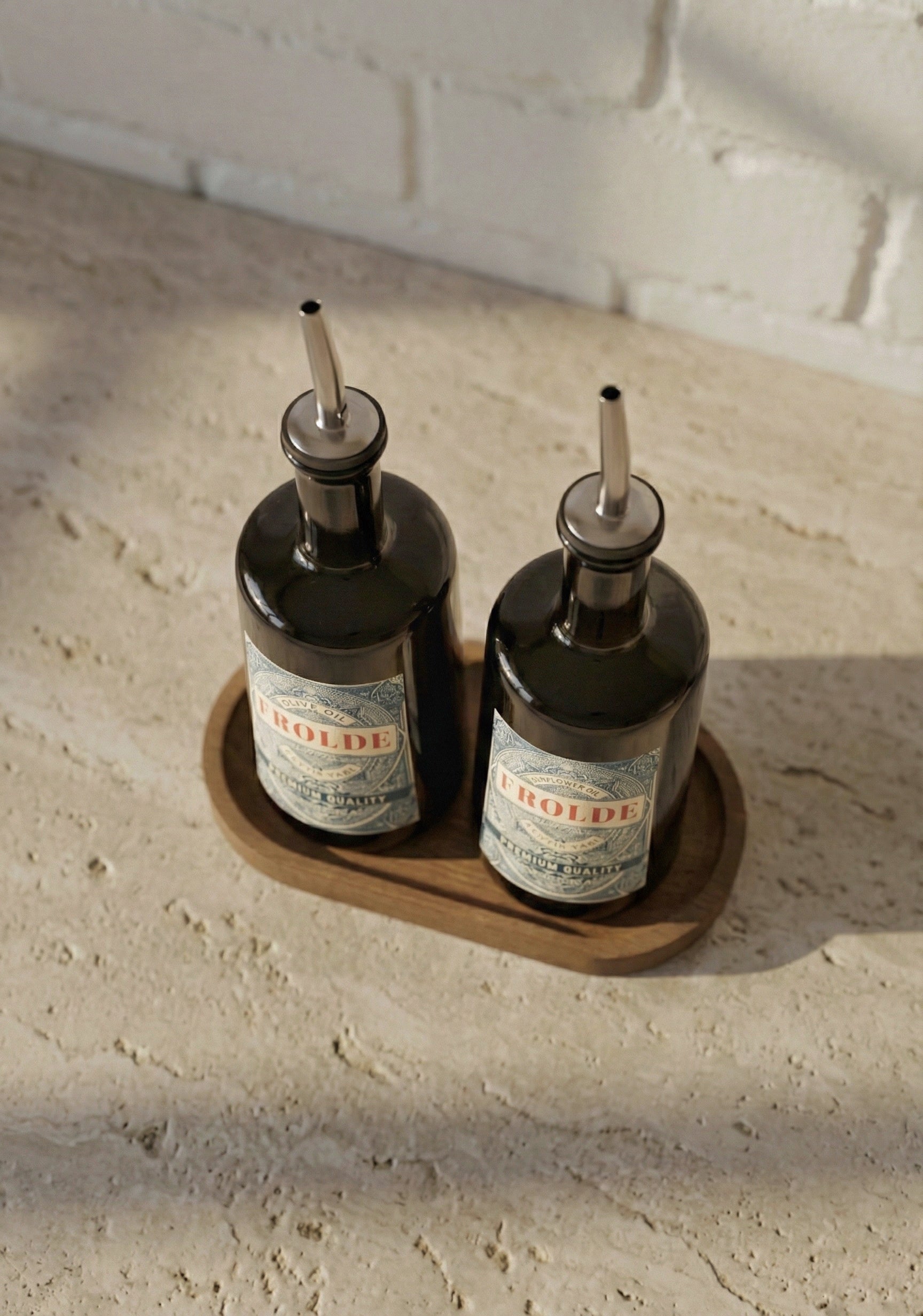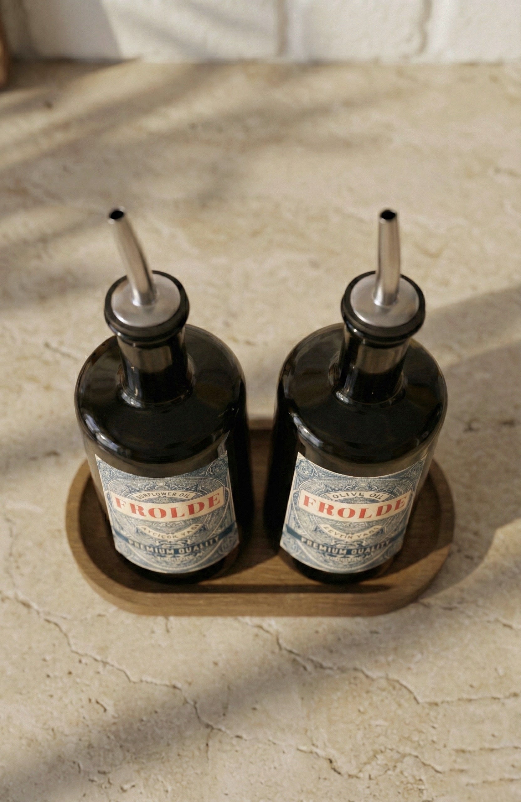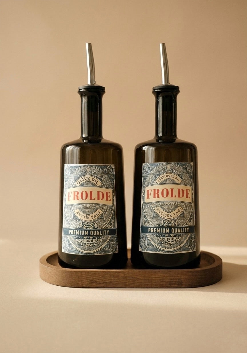 Ahşap Stantlı 2'li Amber 500 ml Yassı Cam Ayçiçek Yağı Zeytinyağı Şişesi Yağdanlık