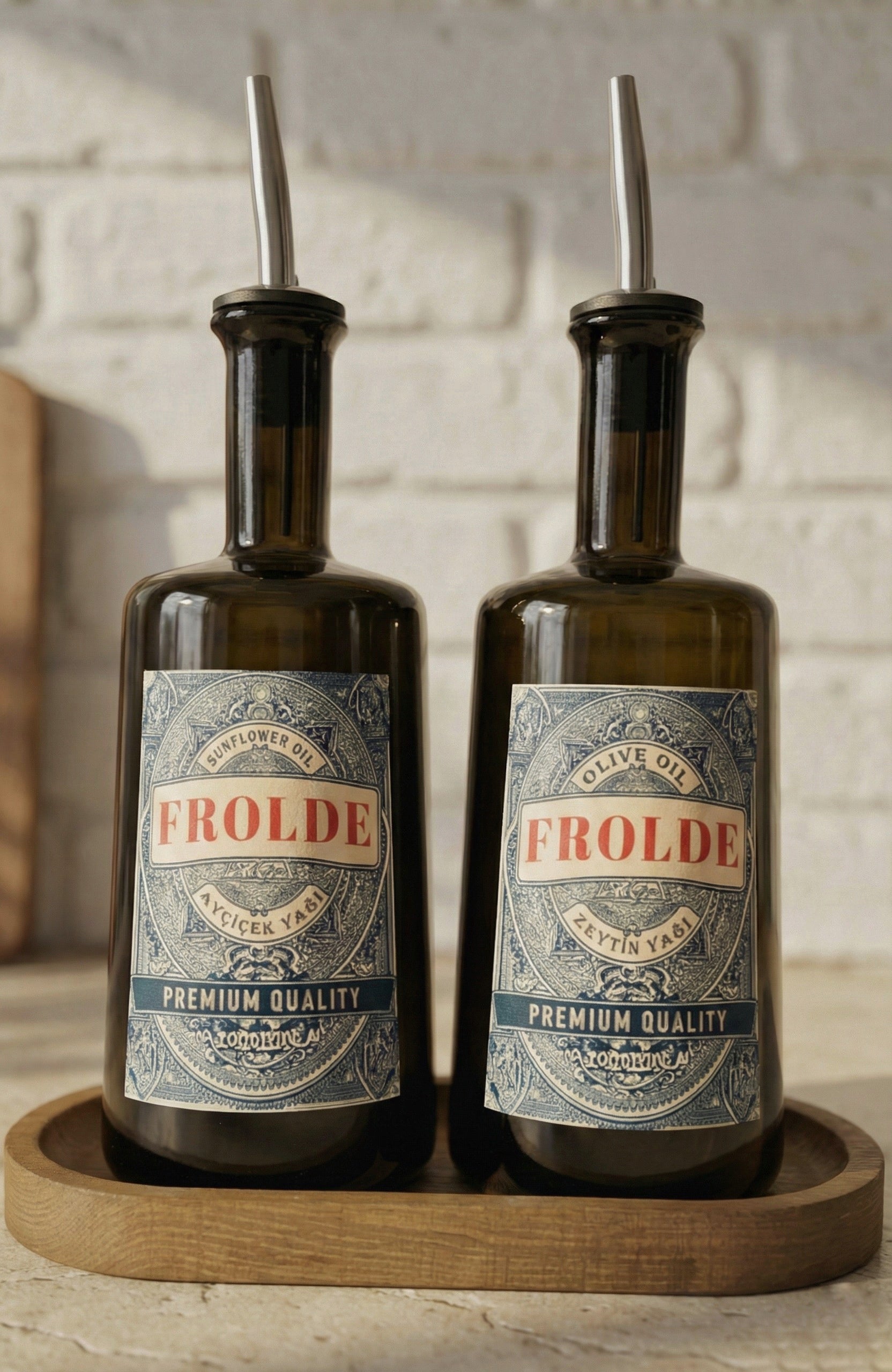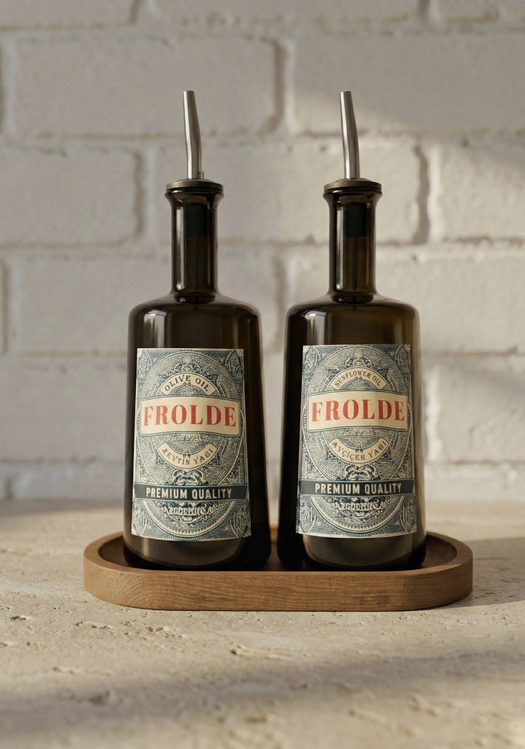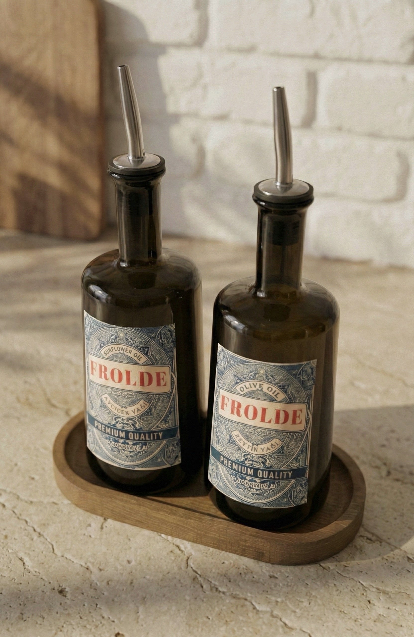 Ahşap Stantlı 2'li Amber 500 ml Yassı Cam Ayçiçek Yağı Zeytinyağı Şişesi Yağdanlık