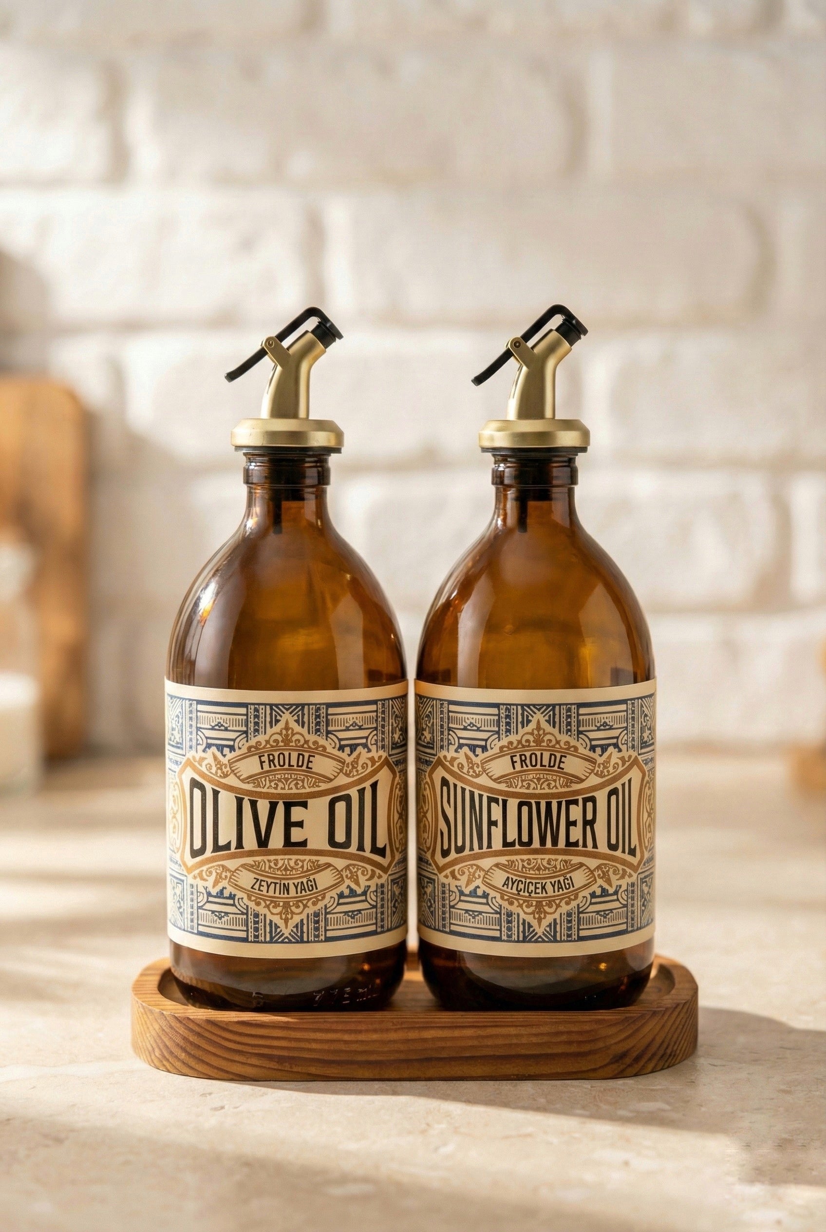 Ahşap Stantlı 2'li Amber 500 ml Yassı Cam Ayçiçek Yağı Zeytinyağı Şişesi Yağdanlık