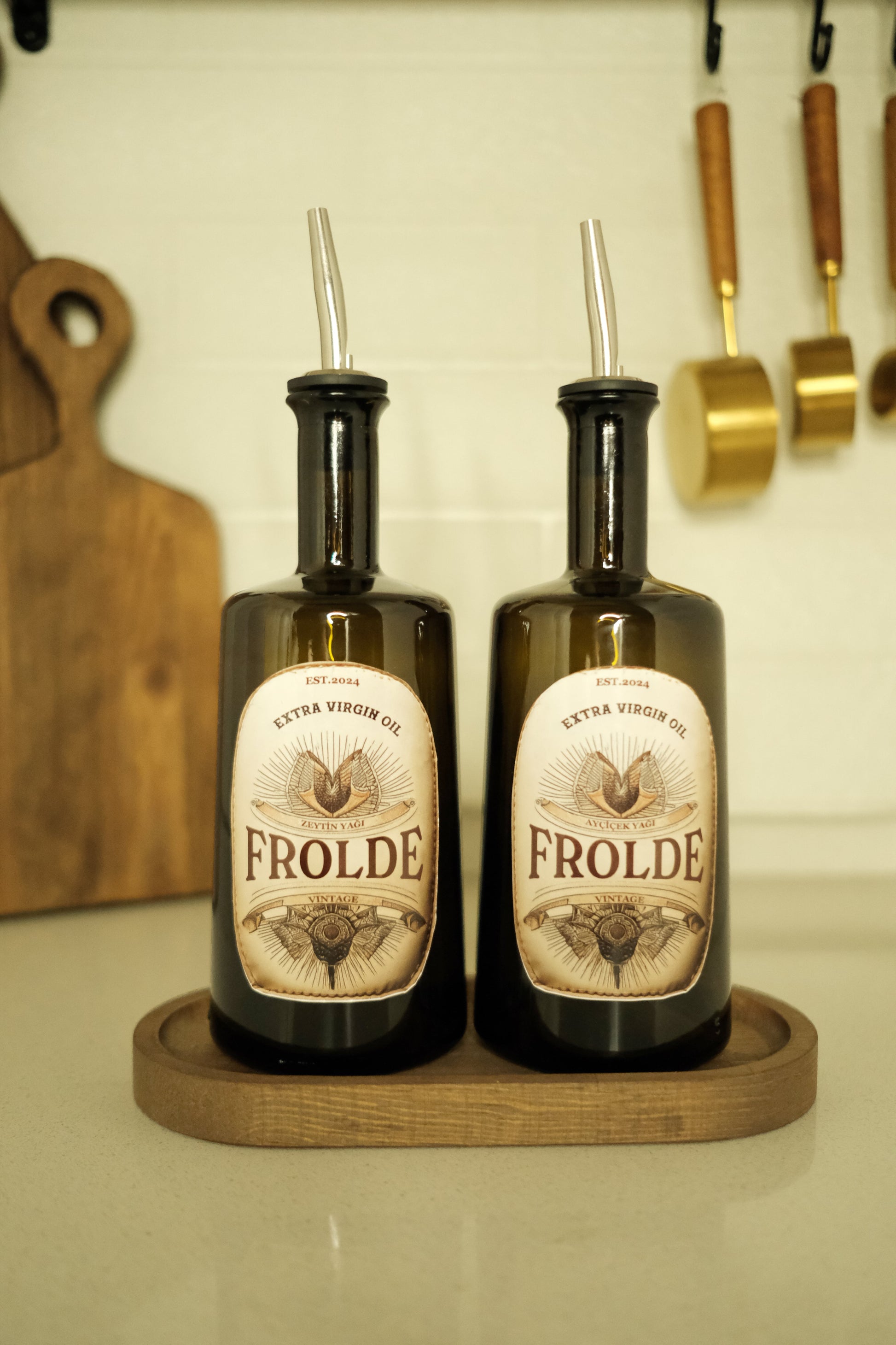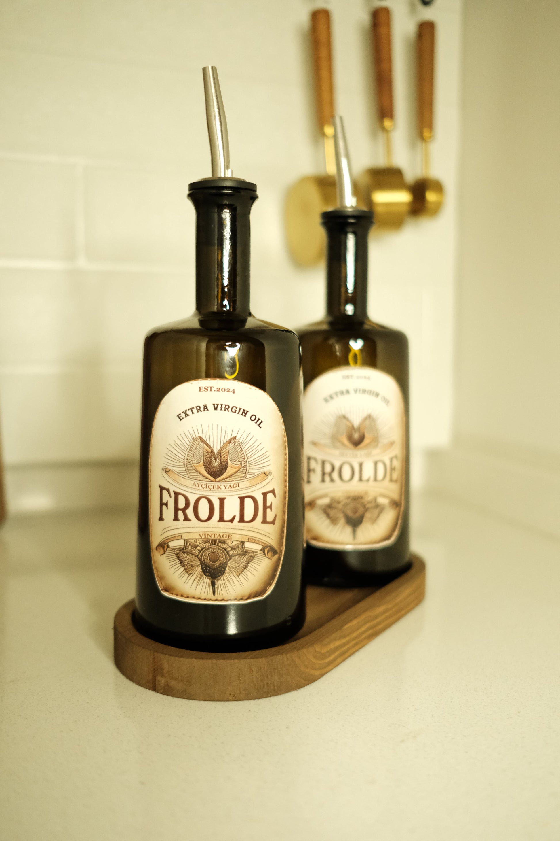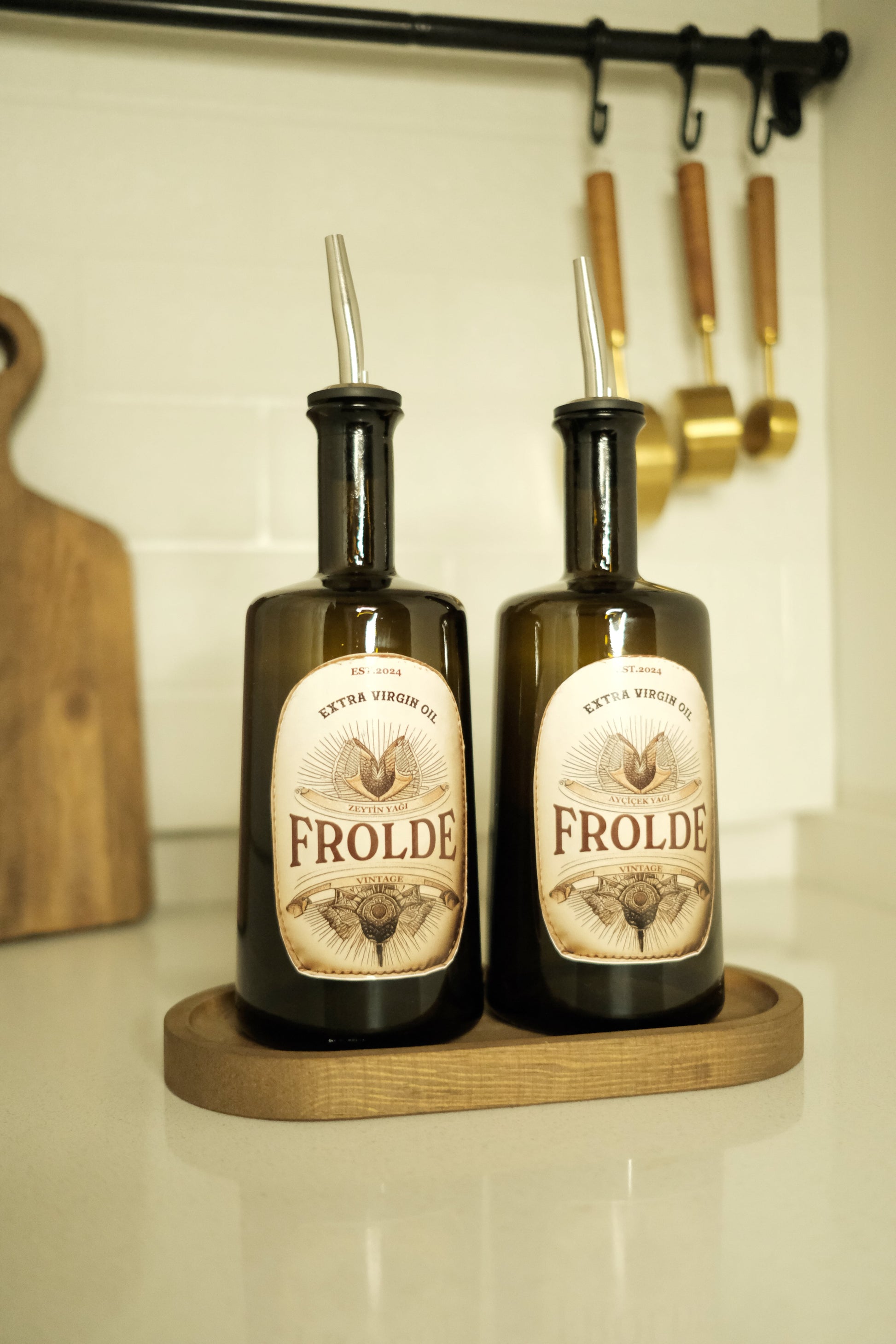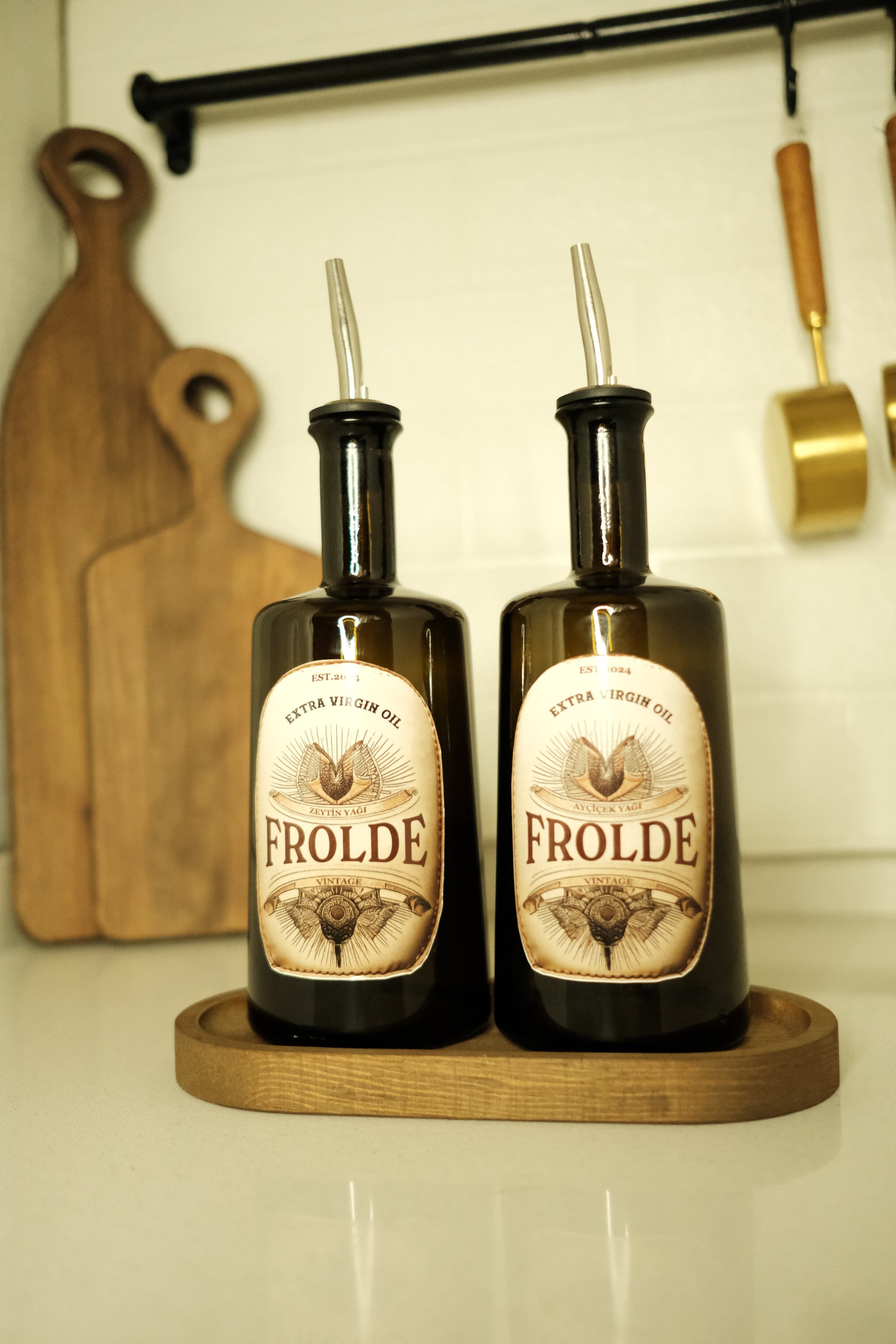 - Ahşap stant üzerinde sergilenen 2'li amber cam şişe, mutfak dekorunuza şık bir dokunuş ekler.