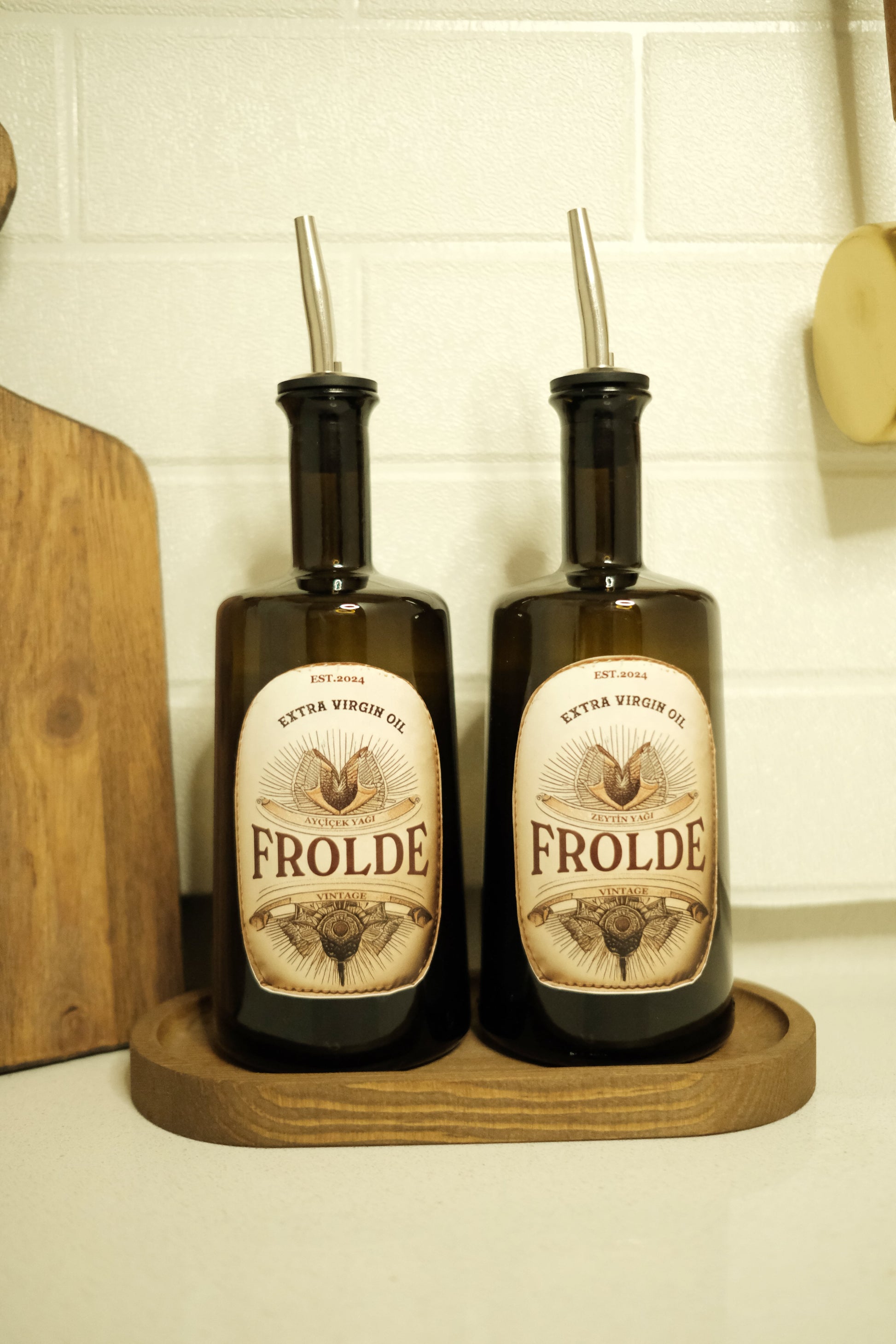 Ahşap Stantlı 2'li Amber 500 ml Cam Ayçiçek Yağı Zeytinyağı Şişesi Yağdanlık