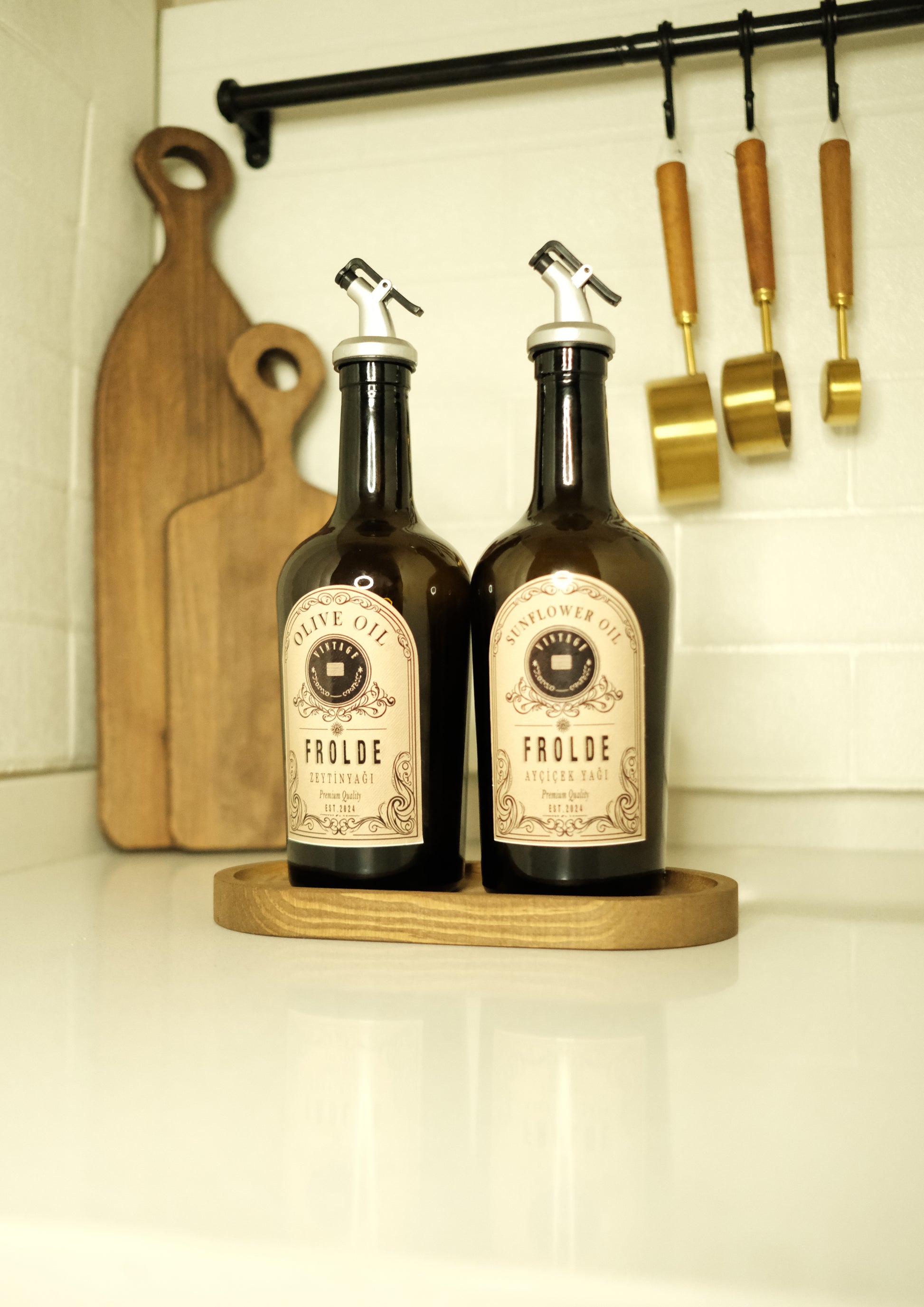 Ahşap Stantlı 2'li Amber 500 ml Cam Ayçiçek Yağı Zeytinyağı Şişesi Yağdanlık