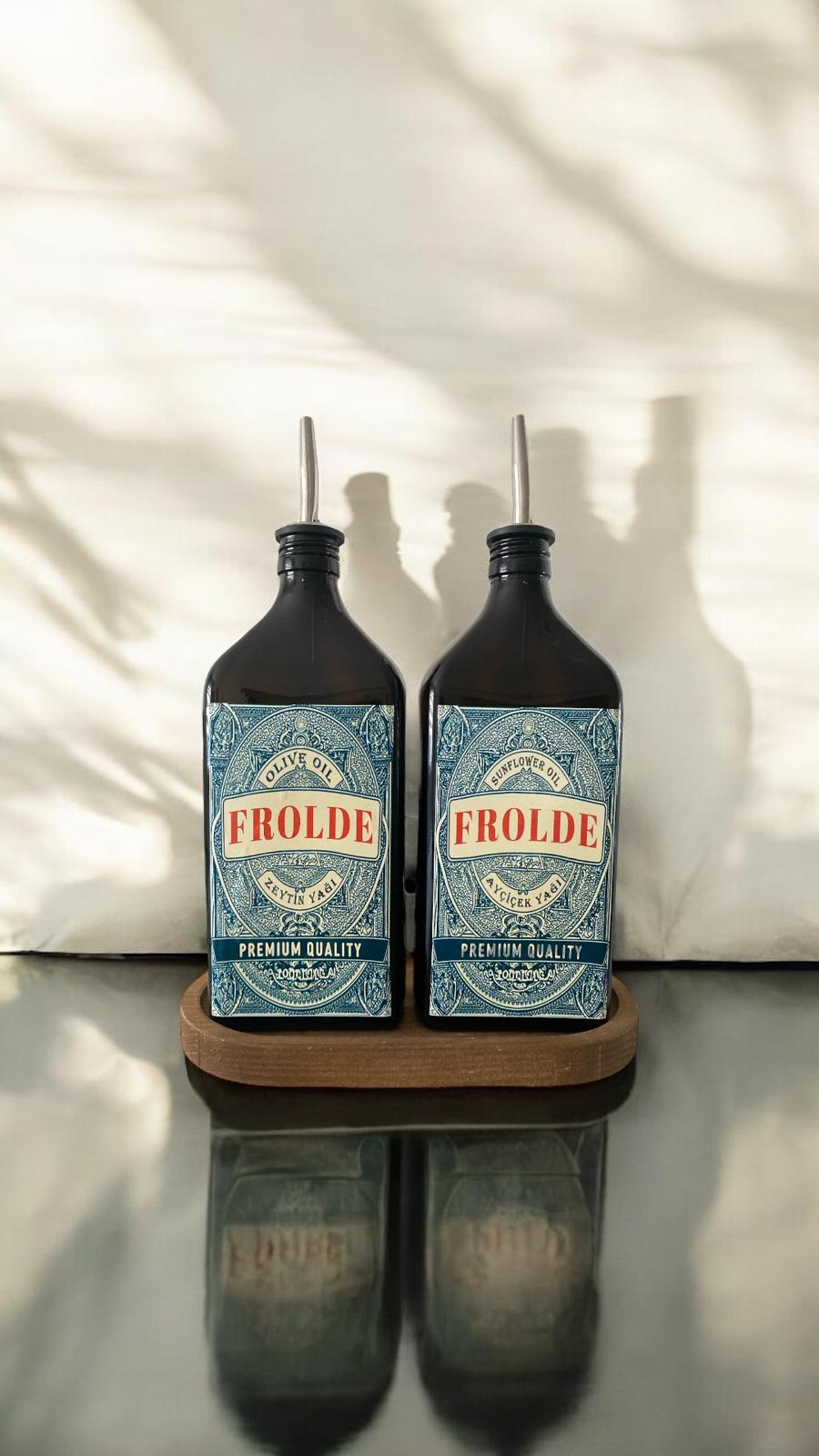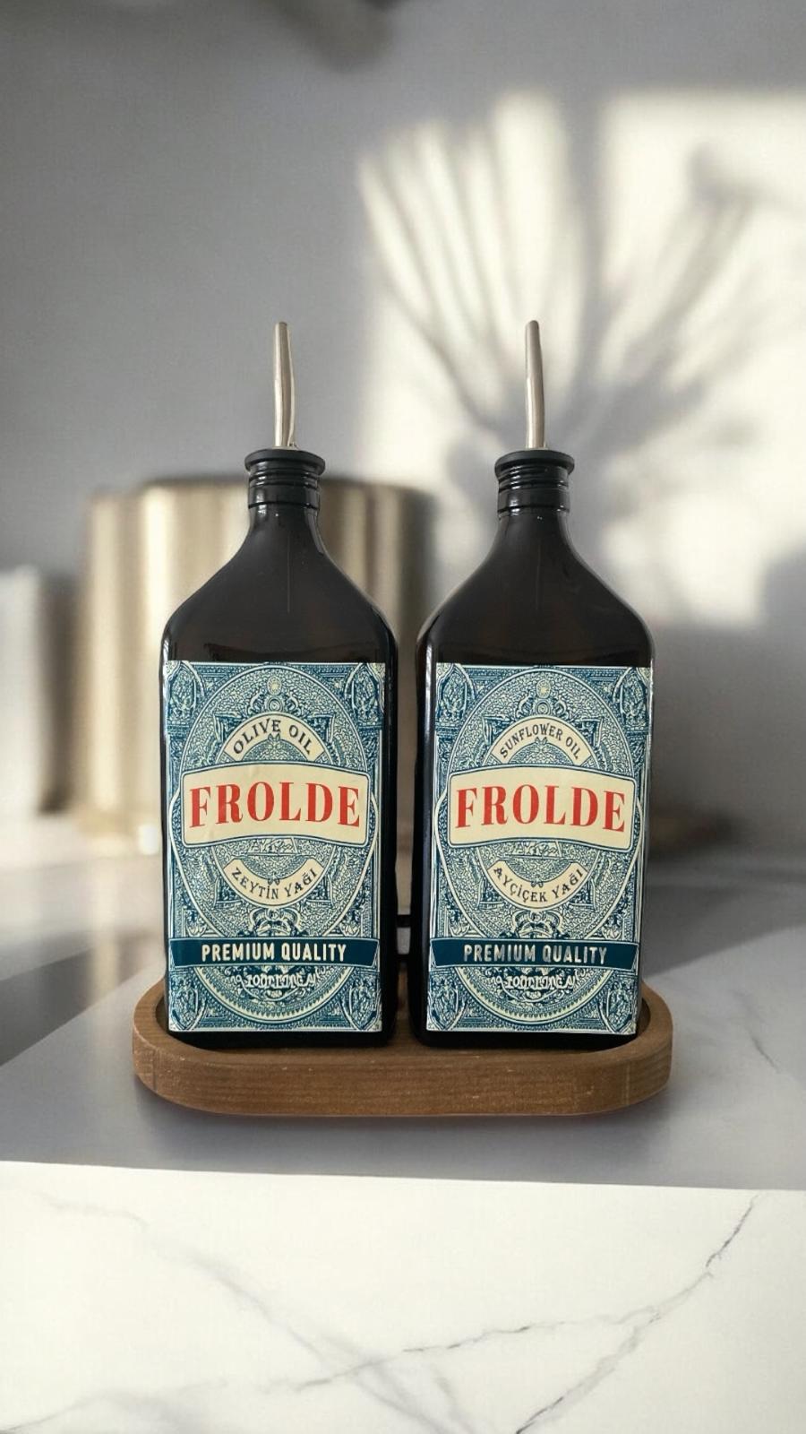 Ahşap Stantlı 2'li Amber 500 ml Yassı Cam Ayçiçek Yağı Zeytinyağı Şişesi Yağdanlık