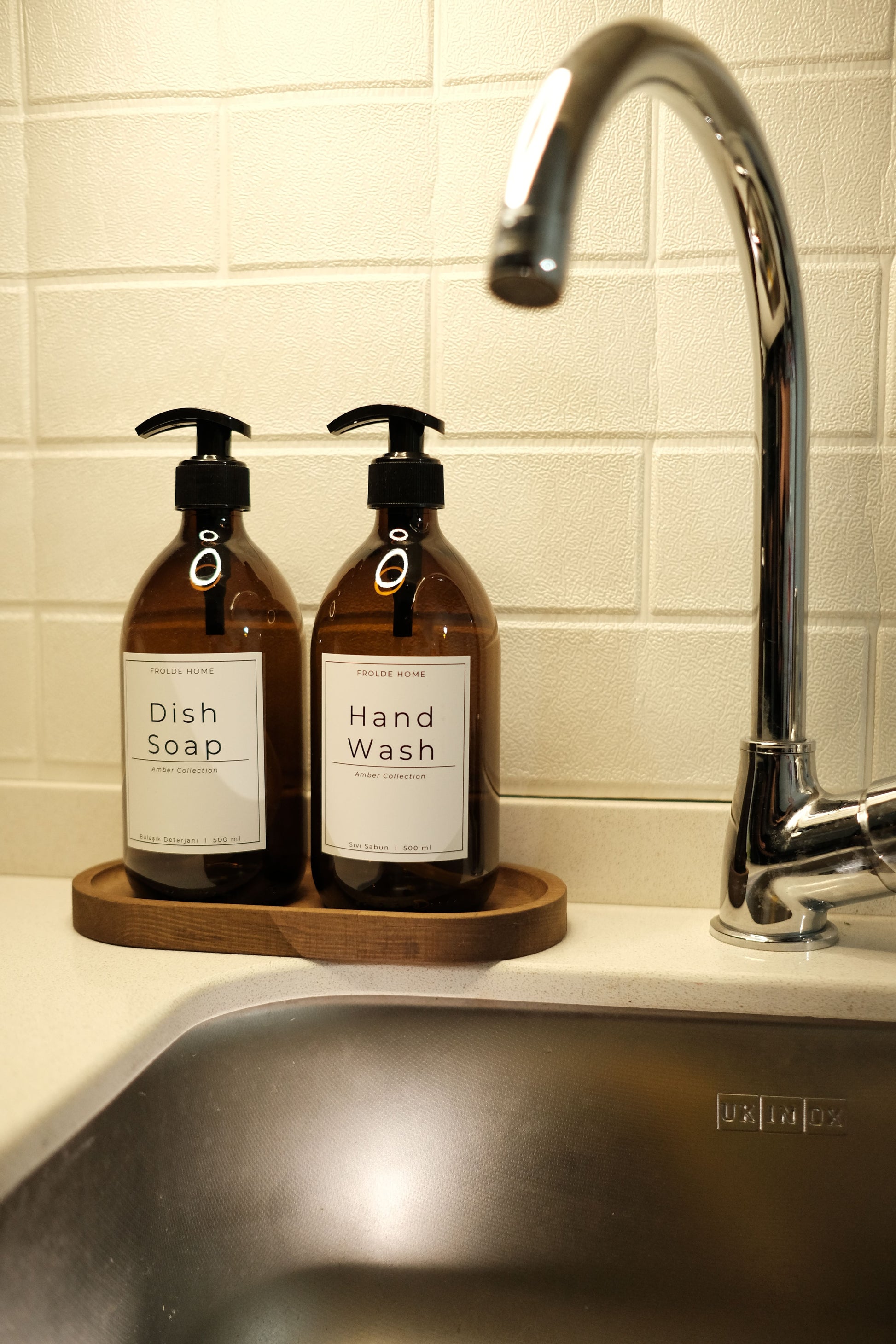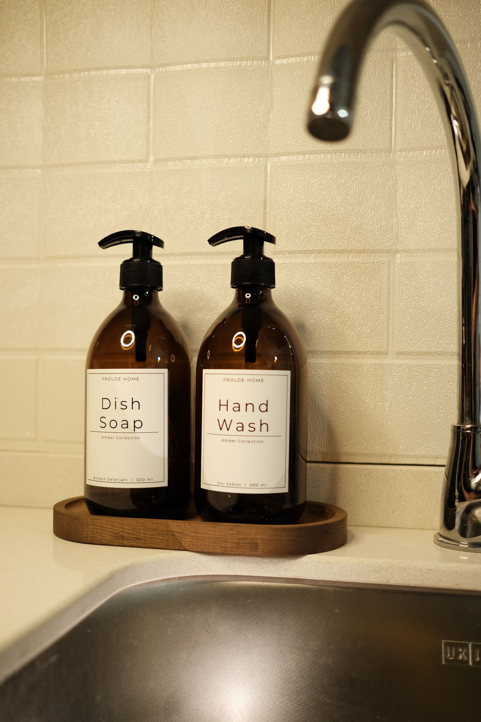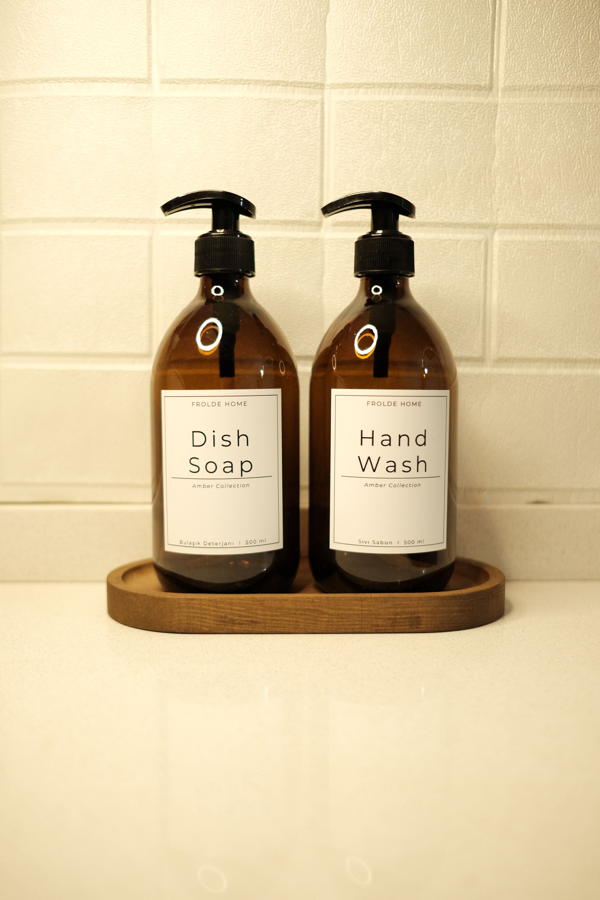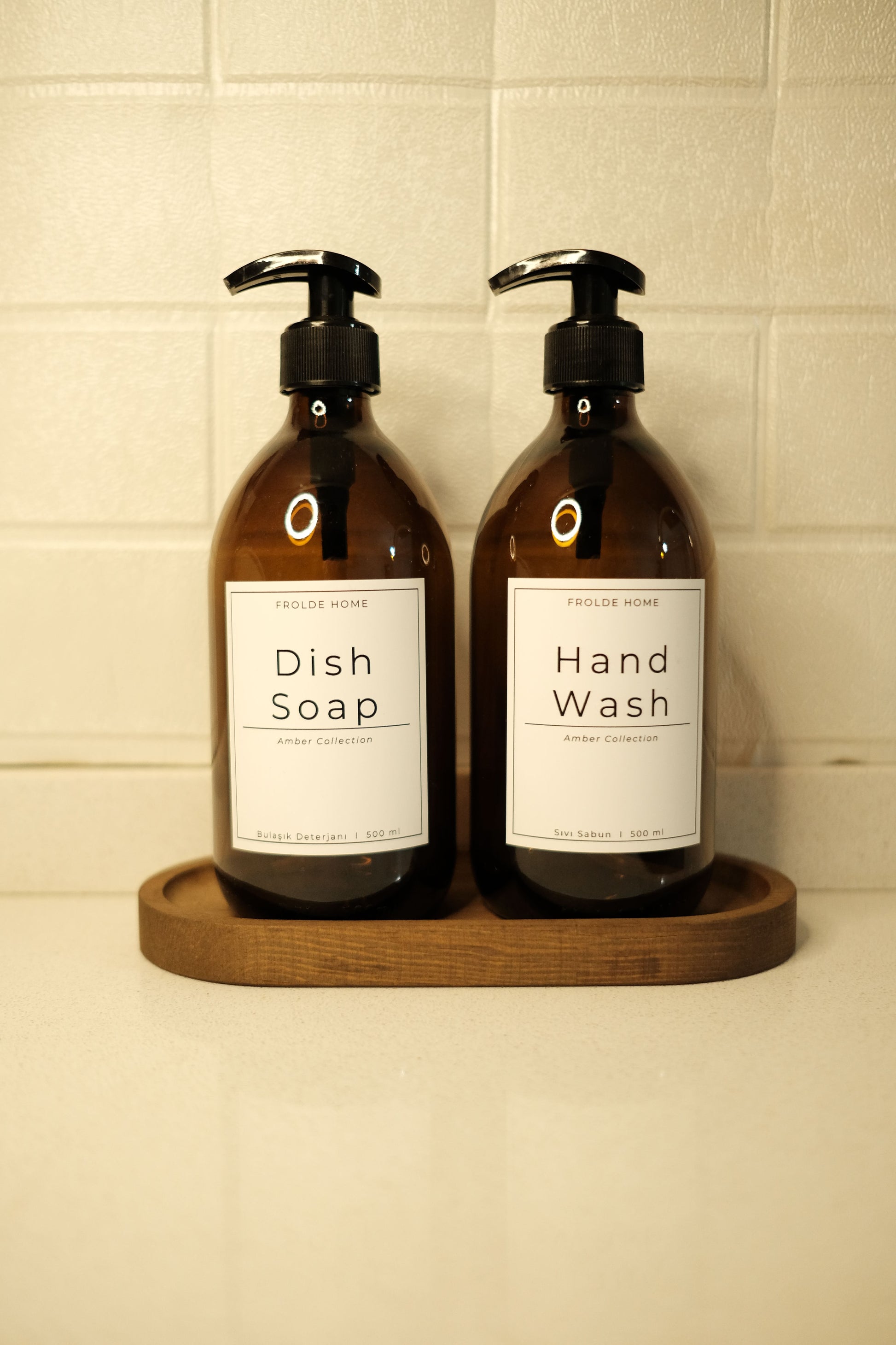 Oval Ahşap Stantlı 2'li Amber Cam Sıvı Sabun Bulaşık Deterjanı Şişesi Sabunluk 500ml