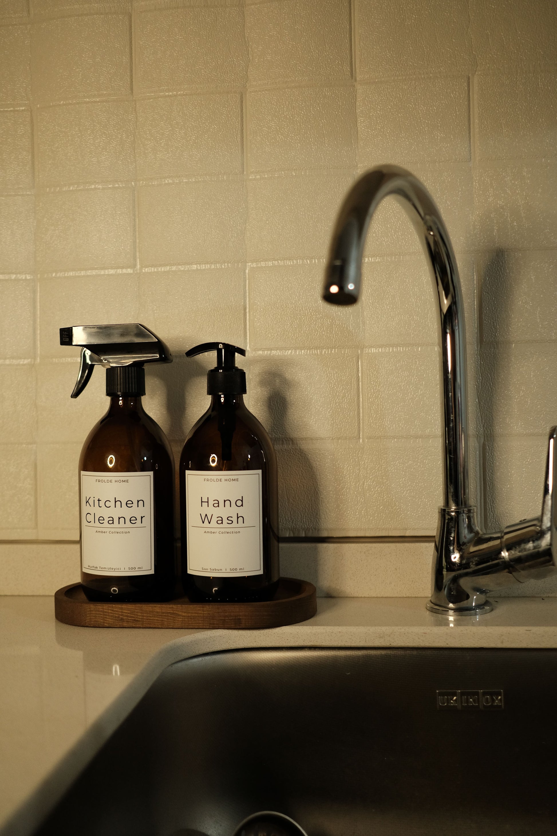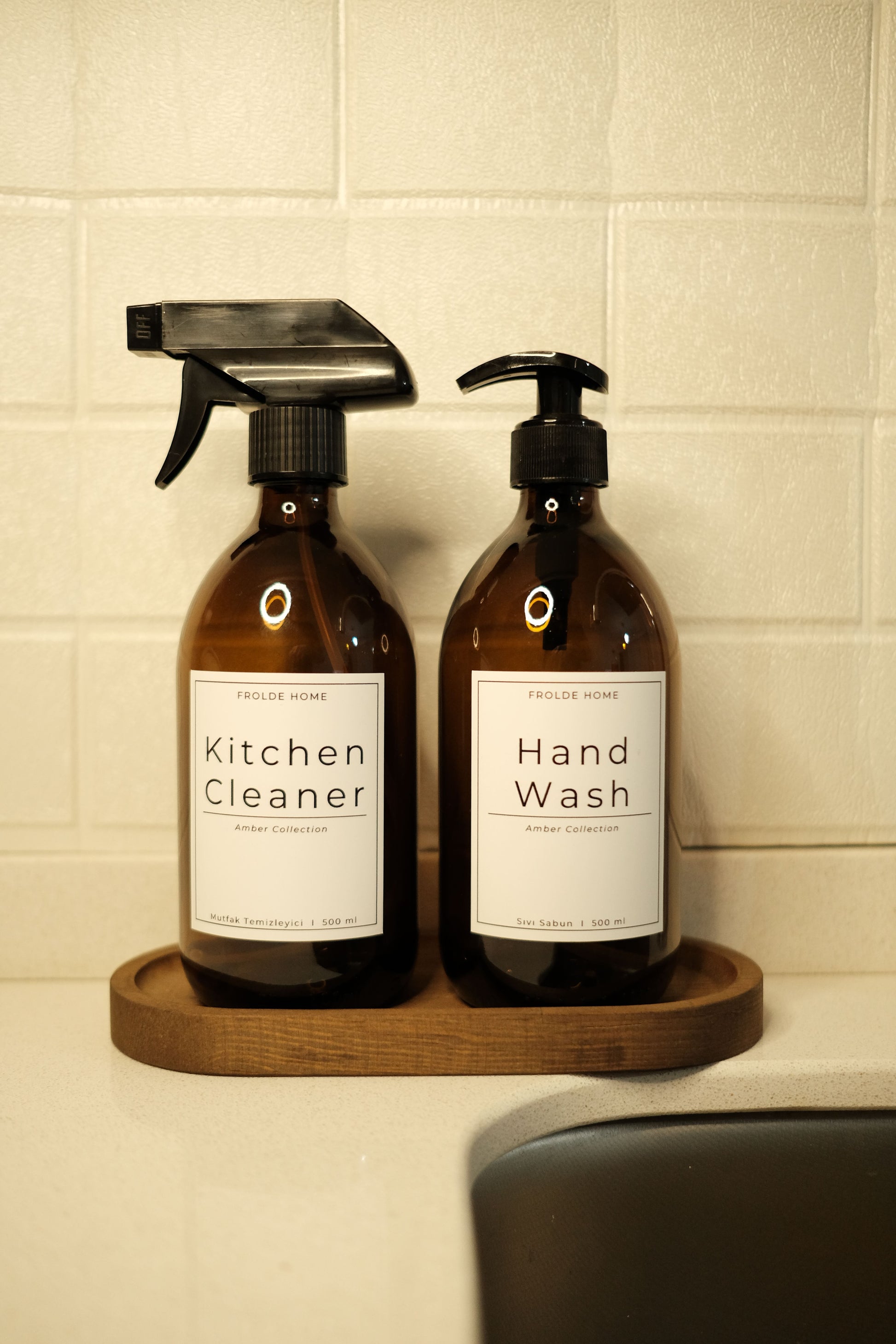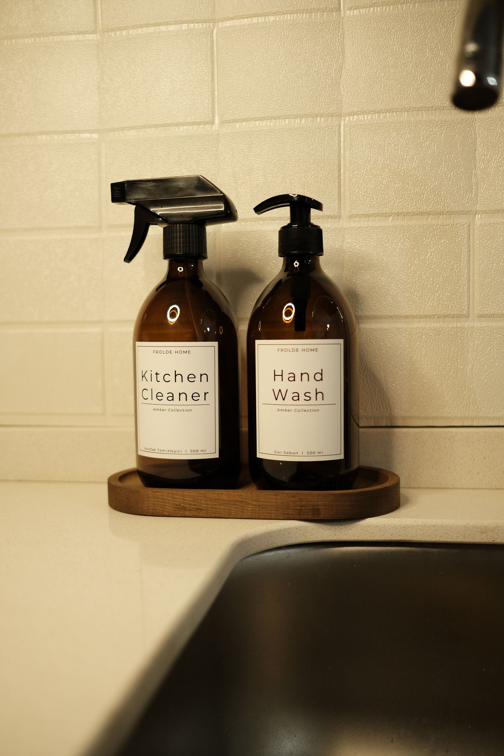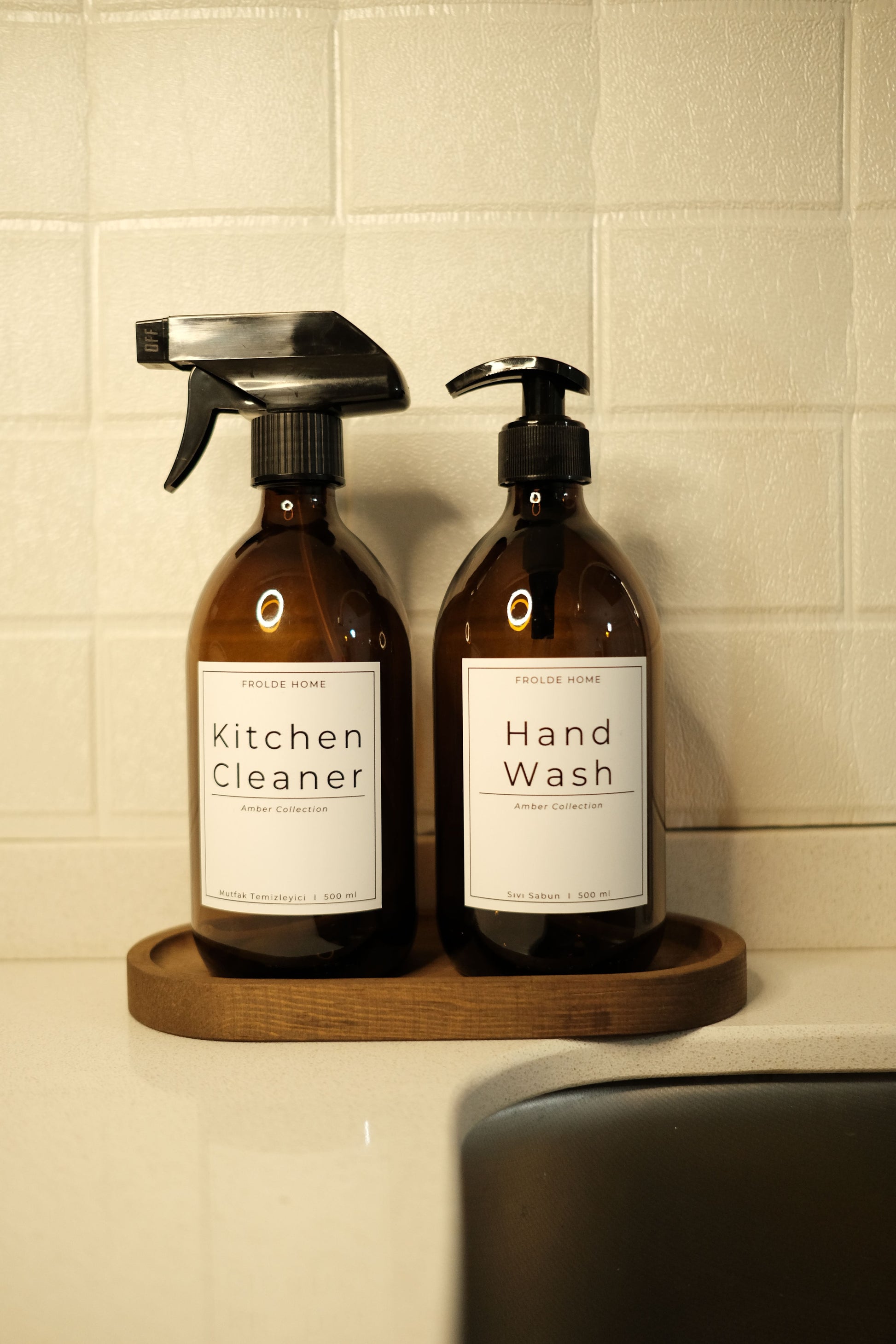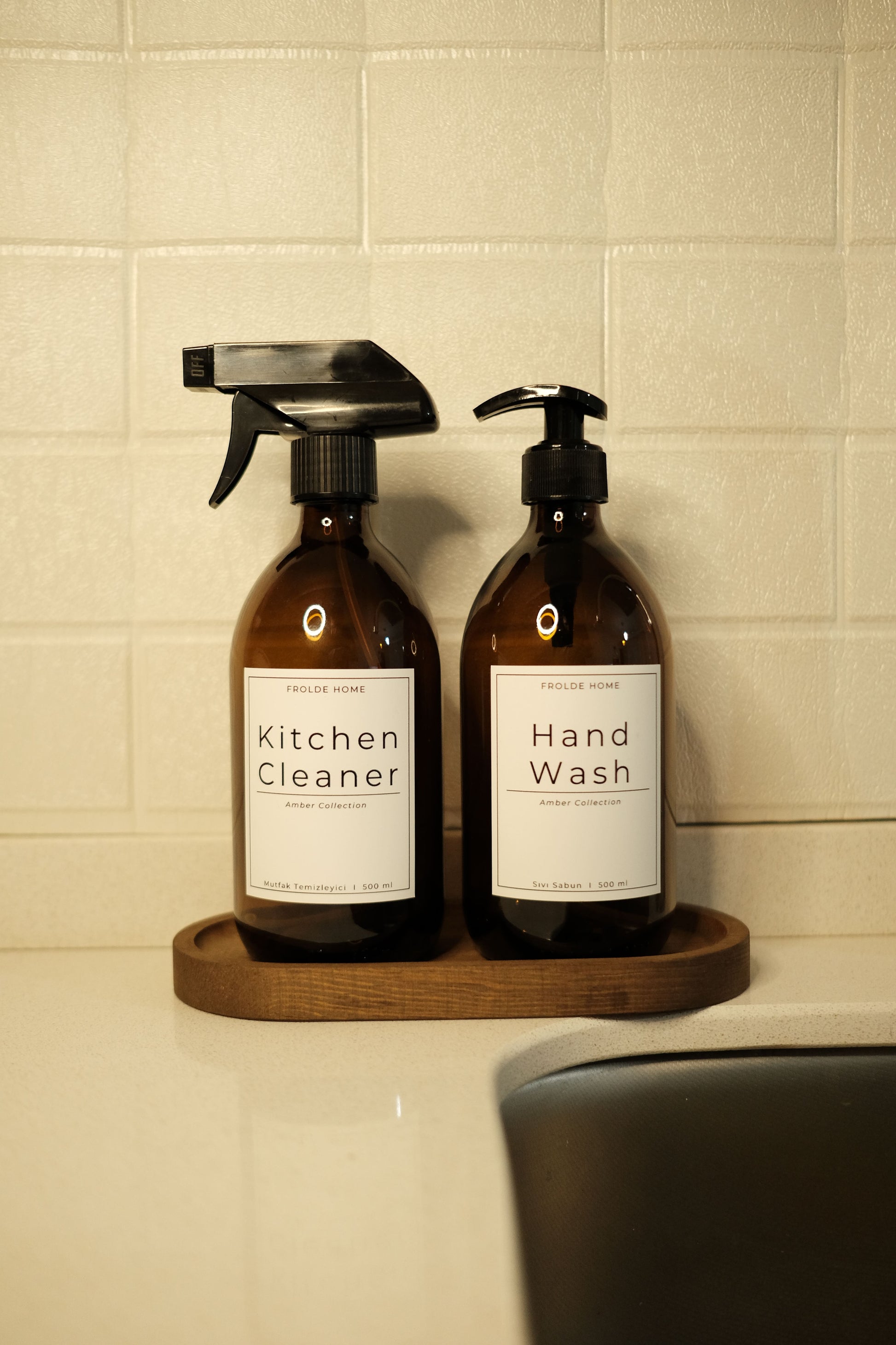 Oval Ahşap Stantlı 2'li Amber Cam Mutfak Temizleyici Bulaşık Deterjanı Şişesi Sabunluk 500ml